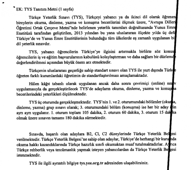 5653 Sayılı Yunus Emre Vakfı Kanunu'nun 3. Maddesi uyarınca Türkiye dışında yapılacak Türk diline dair eğitim, sınav ve belgelendirme faaliyetlerinin Yunus Emre Vakfı tarafından gerçekleştirilmesinin öngörüldüğü, Türkçe Yeterlik Sınavı (TYS) 'nin yılda ÜÇ defa yurt dışında Yunus Emre Enstitülerinin bulunduğu ülkelerde ve Ankara'da düzenlendiği , bir sonraki sınavın 26 Ocak 2019'da yapılacağı belirtilmekte olup, başvuru tarihlerinin 3-28 Aralık 2018 olarak belirlendiği bir örneği aşağıda yer alan Türkçe Yeterlik Sınavı (TYS) ile ilgili tanıtım metni ektedir.